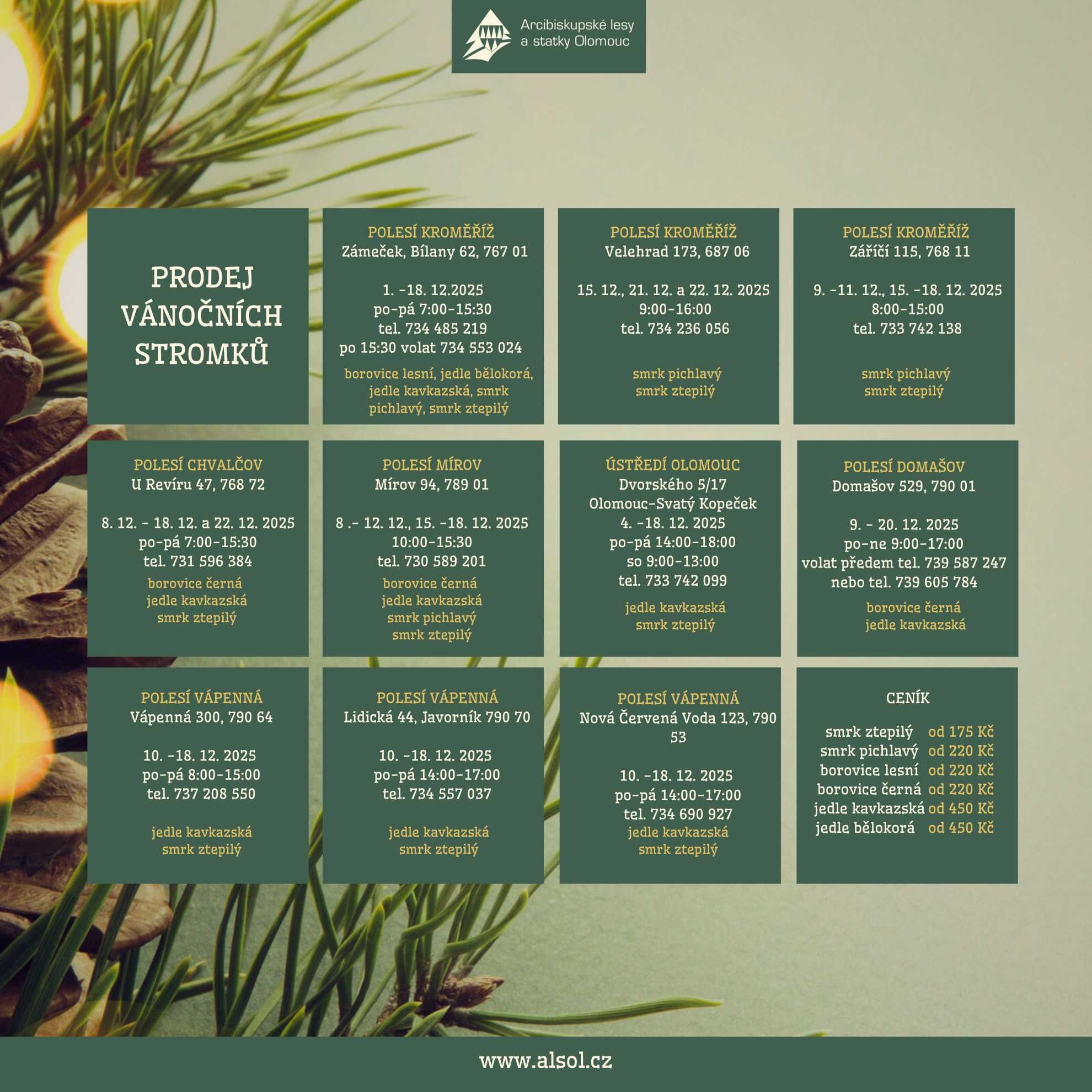 A kde nás najdete? V Olomouci na Svatém Kopečku nebo na našich polesích: Kroměříž, Chvalčov, Mírov, Domašov a Vápenná. Na jednotlivých polesích kolegové zajišťují prodej buď přímo v budově polesí anebo na jednotlivých hájenkách. Přehled všech prodejních míst naleznete v přiloženém letáku, nebo v záložce Pro veřejnost/Prodej vánočních stromků: https://www.alsol.cz/pro-verejnost/prodej-vanocnich-stromku