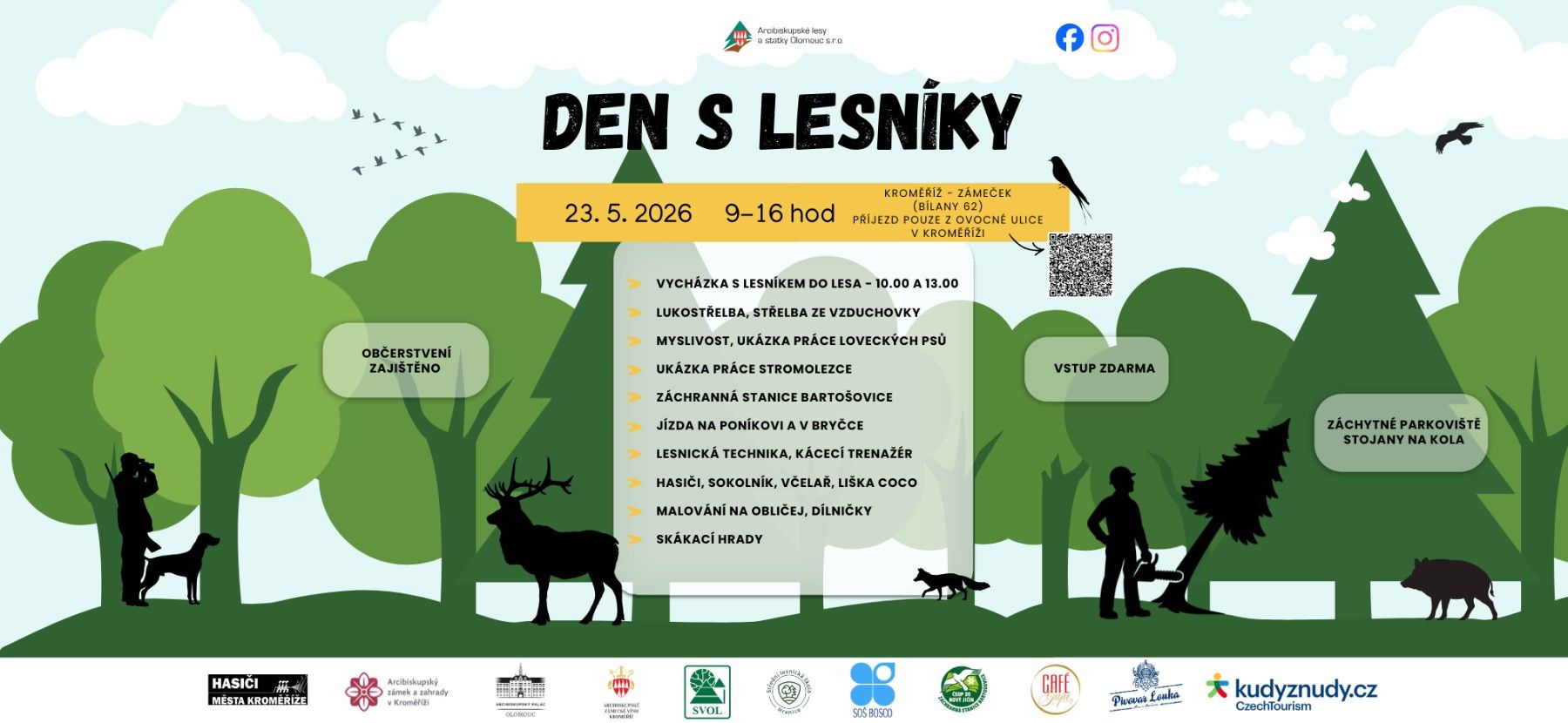 Srdečně Vás zveme na akci pro celou rodinu! Čeká na Vás celodenní program s lesnickou a mysliveckou tématikou, zábavná lesní pedagogika, ukázka lesnické a hasičské techniky, lukostřelba i střelba ze vzduchovky, ukázka loveckých plemen psů, koně, liška Coco, vystoupení sokolníka a mnoho dalšího...